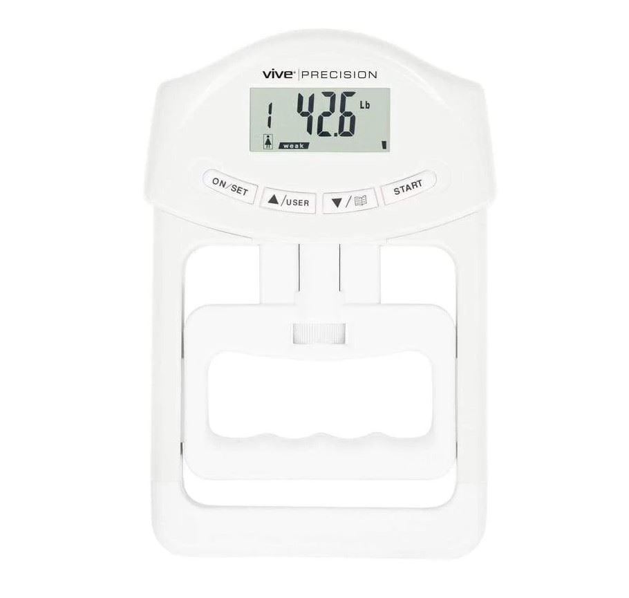 The Precision grip tester accurately measures grip strength up to 198 pounds in 0.2-pound increments.